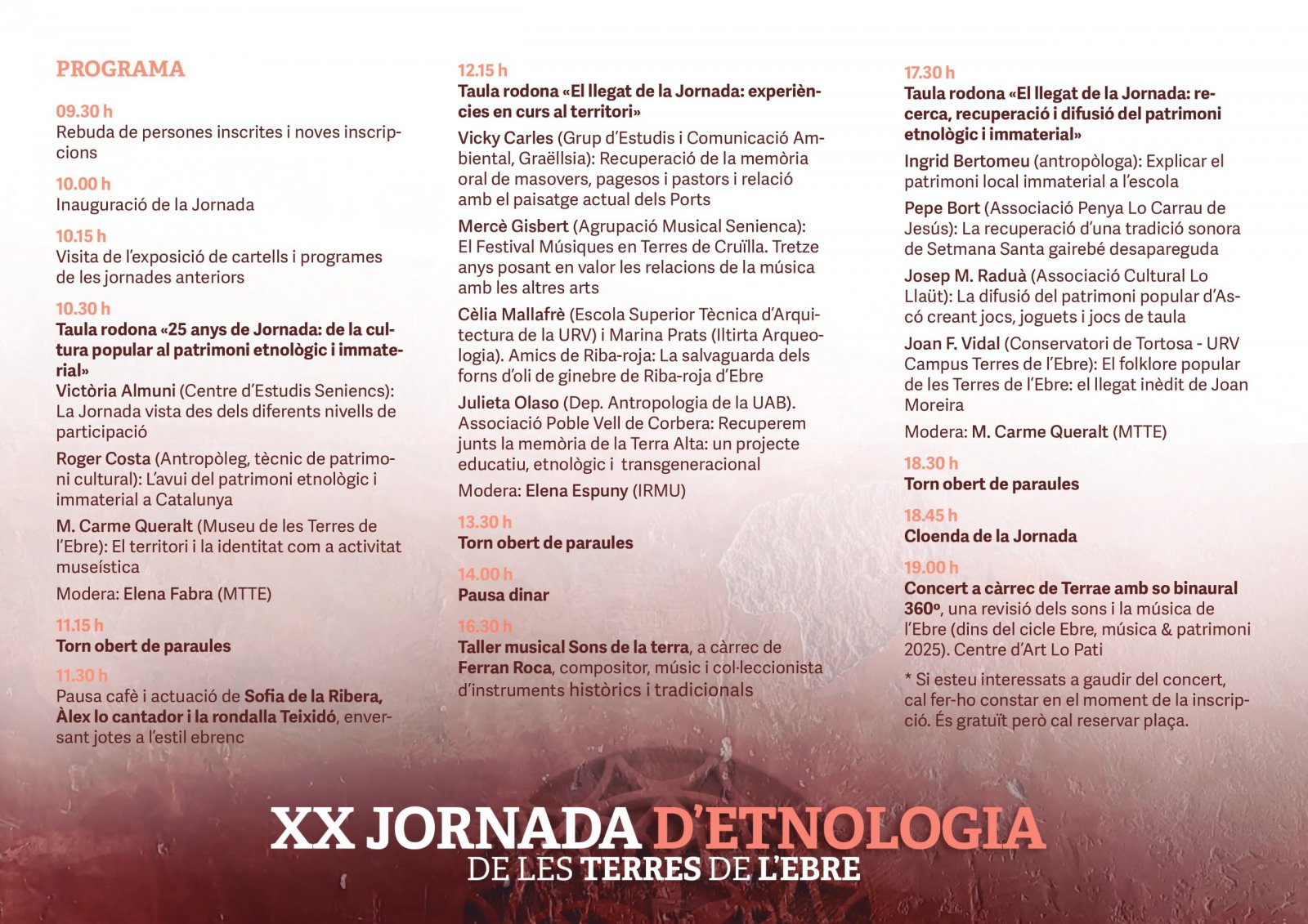 L’edició d’enguany busca incentivar la reflexió conjunta i el debat, motiu pel qual el programa s’estructura a partir de les taules rodones "25 anys de Jornada: de la cultura popular al patrimoni etnològic i immaterial", "El llegat de la Jornada: experiències en curs al territori" i "El llegat de la Jornada: recerca, recuperació i difusió del patrimoni etnològic i immaterial". Tres espais, amb el seu posterior torn obert de paraula, en els quals s’oferirà una revisió històrica de la jornada al llarg dels seus 25 anys, així com es presentaran projectes de recerca del patrimoni etnològic desenvolupats per entitats culturals i per investigadors de les quatre comarques ebrenques. Tot aquest recorregut estarà sostingut, a més a més, per la visita a l’exposició de cartells i programes de les jornades anteriors.