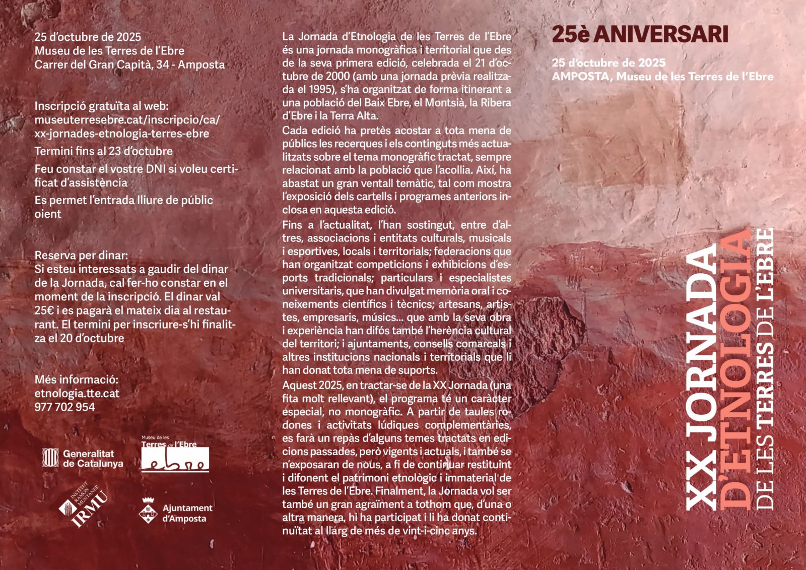 Aquest dissabte, 25 d’octubre, la XX Jornada d’Etnologia de les Terres de l’Ebre tindrà lloc al Museu de les Terres de l’Ebre, a Amposta, amb una edició commemorativa que celebra una fita molt rellevant: 25 anys de treball i difusió del patrimoni etnològic i immaterial de les Terres de l’Ebre.